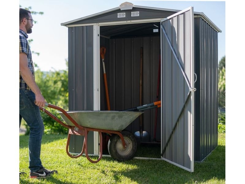 Zahradní domek plechový je vyrobený z elektrolyticky pozinkovaného ocelového plechu. Stylovou kůlnu navíc doplňují křídlové dveře, s nimiž se snadno manipuluje ocelovým madlem. Díky tomu můžete z kovové kůlny vynášet malé i velké předměty, aniž by vám křídlové dveře překážely. Zařízení pro visací zámek umožňuje zabezpečit uschované vybavení (visací zámek není součástí dodávky).