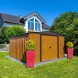 Zahradní kůlna spojuje všechny výhody extrémně robustní konstrukce z ocelového plechu se stylovým, přírodním dřevěným vzhledem. Na rozdíl od dřevěných přístřešků proto tento plechový přístřešek nevyžaduje žádnou pravidelnou péči ani údržbu.