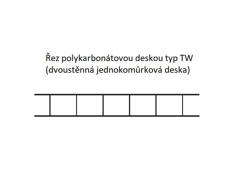 Čirá, komůrková, čtyřstěnná deska z polykarbonátu o síle 10 mm. Jednostranný UV filtr na ochranu proti slunečnímu záření. Světelná prostupnost: 74 %. Smluvní záruka 10 let na nerozbitnost krupobitím. Renomovaný výrobce Brett Martin (VB).