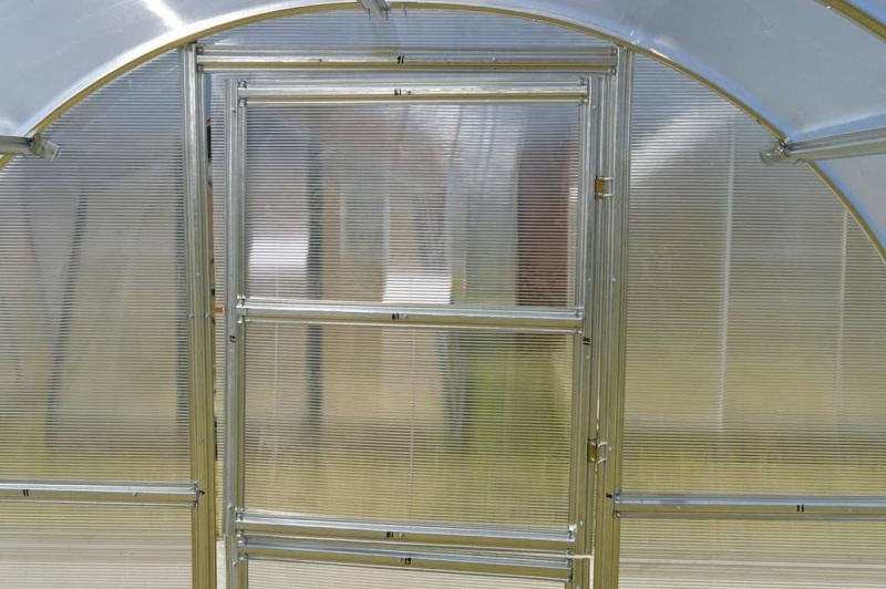 Malá rozteč oblouků garantuje vysokou únosnost celé konstrukce skleníku. Přední a zadní čela skleníku mají vestavěné dvojité dveře, takže skleníkem je možné procházet z obou stran. Pokud otevřete horní část dveří na obou koncích skleníku, zajistíte tím pohodlné větrání celého skleníku, aniž by do něj měly přístup děti nebo domácí zvířata.