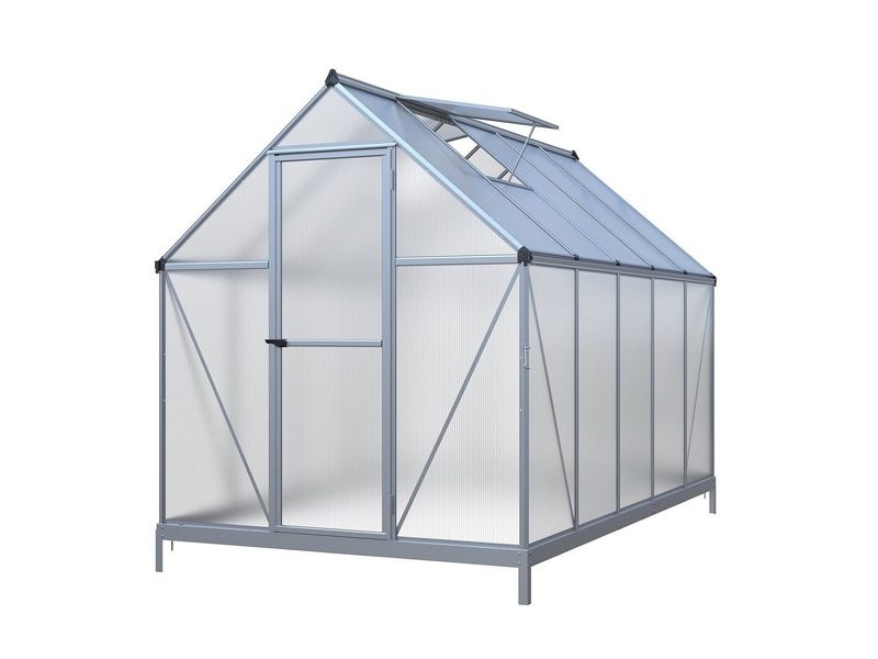 Skleník z polykarbonátu o síle 4 mm. Odolná hliníková konstrukce – stříbrná nebo černá. 2× stř. okno. Dveře na pantech. Základna v ceně.