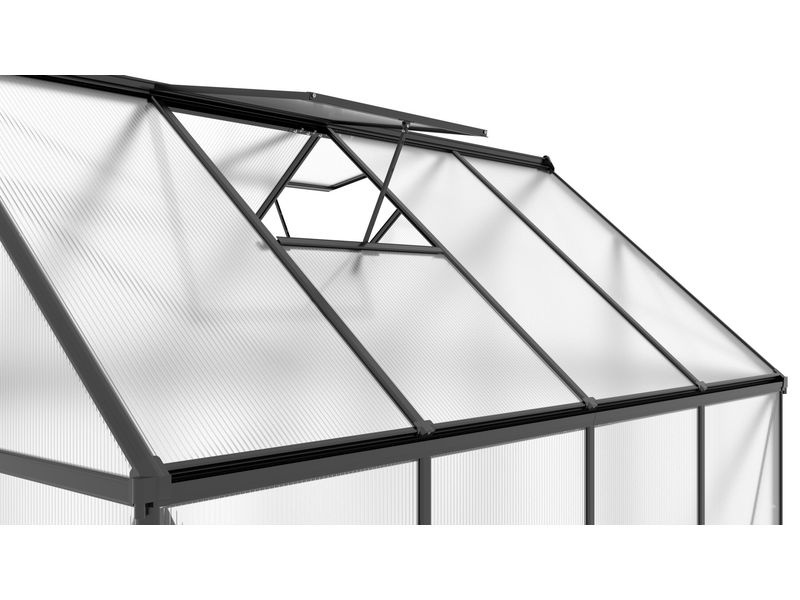 Skleník je dále vybaven uzavřenými bočními hranami polykarbonátu, které přispívají k jeho dlouhodobé trvanlivosti. Hlavní předností modelu jsou zesílené nosné profily, které výrazně zvyšují jeho pevnost a odolnost vůči povětrnostním podmínkám, jako je silný vítr a sněhové zatížení.