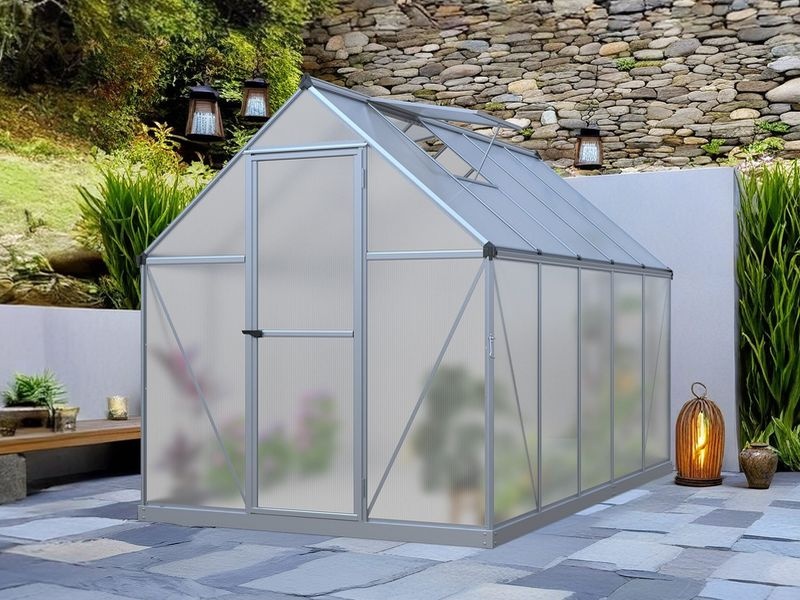 Skleník z polykarbonátu o síle 4 mm. Odolná hliníková konstrukce – stříbrná nebo černá. 2× stř. okno. Dveře na pantech. Základna v ceně.