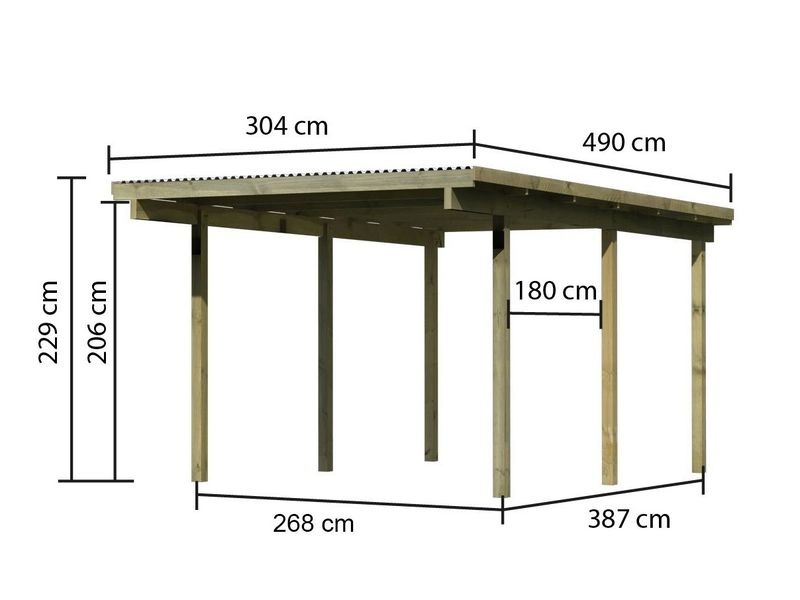 Bytelný dřevěný přístřešek na 1 auto od německého výrobce. Rozměry carportu: 490 × 206 × 250 cm (d×vך). Přístřešek je vhodný jako ochrana automobilu před UV zářením, deštěm nebo krupobitím. Zastavěná plocha: 14,90 m2.
