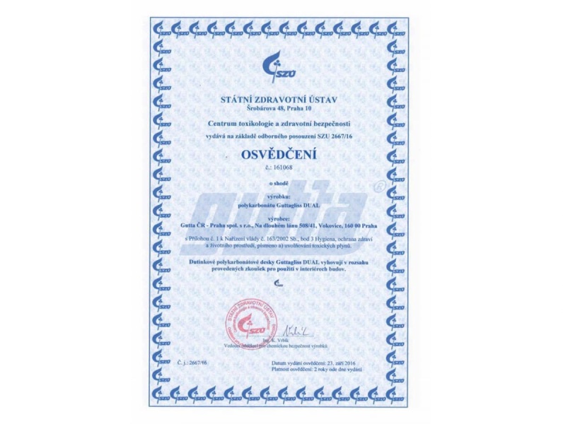 Na zastřešení je použit polykarbonát o tloušťce 10 mm, který má dlouhou životnost a zachovává si barevnou stálost (nežloutne). Polykarbonátové desky jsou zdravotně nezávadné.