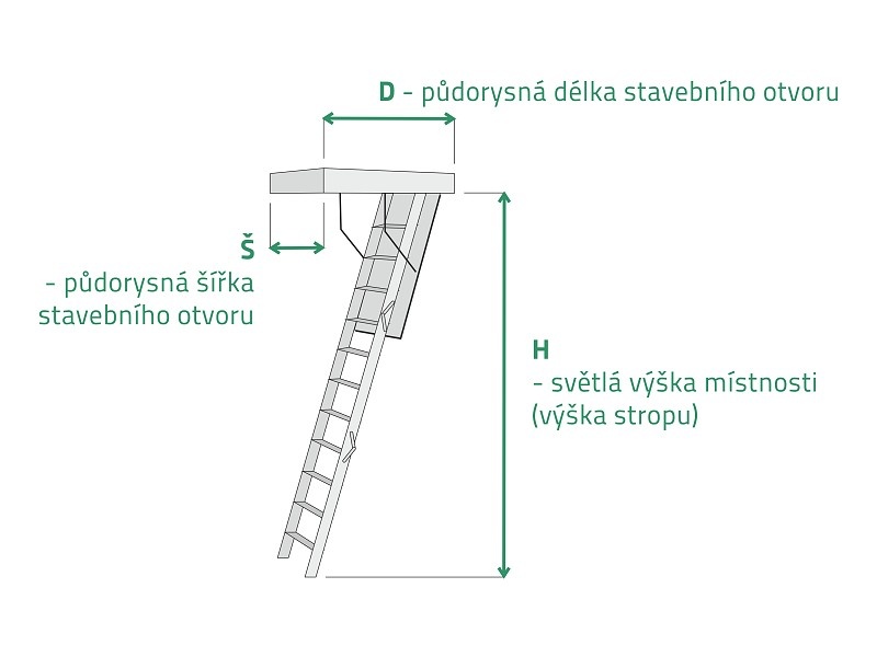 Objednávaný rozměr schodů je rozměrem hrubého stavebního otvoru. Rám půdních schodů je ve skutečnosti o 10mm menší – pro snadnější instalaci.