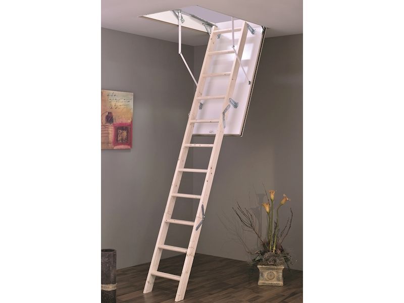 Tento model stropních schodů má celodřevěnou konstrukci. Zateplené víko s falcem a celoobvodovým těsněním je oboustranně opláštěn bílou HDF deskou. Na víku je namontován složený čtyřdílný žebřík.