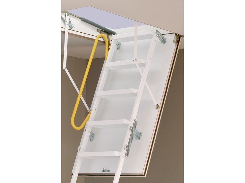 Na tomto víku je namontován složený třídílný, práškově lakovaný ocelový žebřík opatřený gumovými stopkami. Půdní schody jsou opatřeny párem ocelových pružin, které brzdí pád při otevírání a napomáhají při zavírání. součástí vybavení je boční madlo.