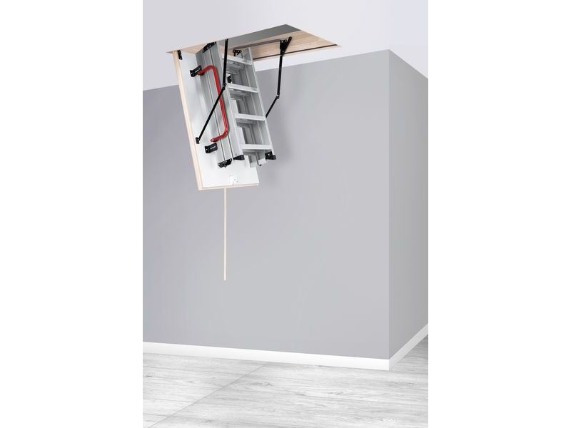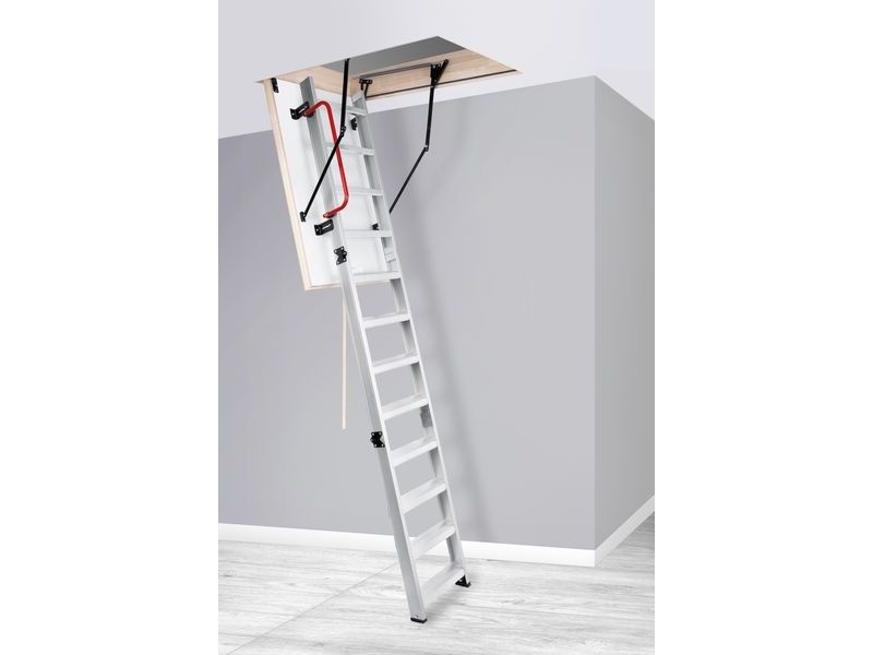 Hliníkové skládací půdní schody slouží jako snadný a zateplený výlez do půdních prostor. Max. přípustná zátěž: 160 kg. Tloušťka izolace: 40 mm. Max. výška podlaží: 280 cm.