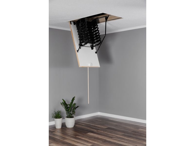 Díky nůžkovému žebříku lze schody jednoduše roztáhnout pro výlez do půdních prostor a následně je zatáhnout pro případ zavření schodů. Nůžkový žebřík roztahujete a stahujete jako harmoniku.
