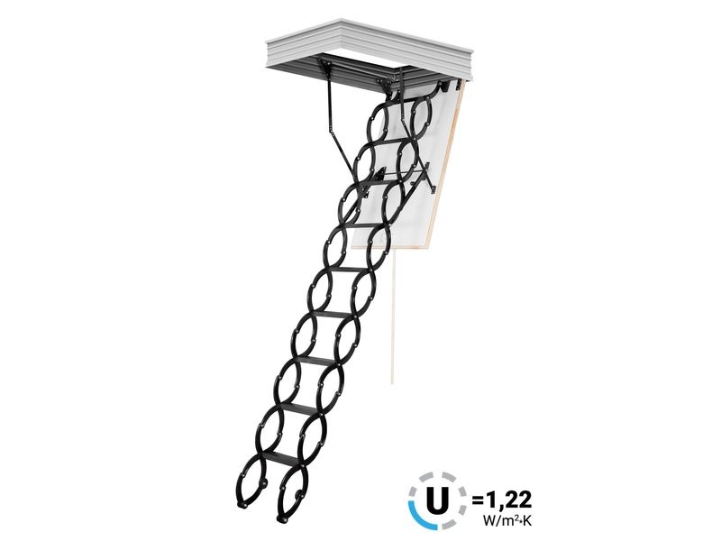 Nůžkové půdní schody Oman Flex Termo Metal Box jsou vhodné i do těch nejmenších prostor. Nejen elegantní design, ale i praktické a jednoduché ovládání schodů vás jistě potěší. Max. přípustná zátěž: 150 kg. Tloušťka izolace: 20 mm.