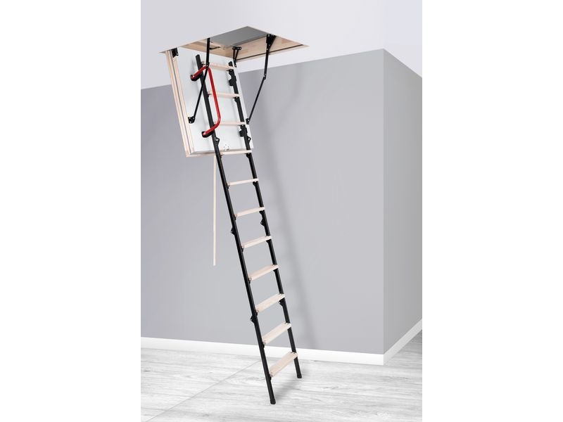 Skládací schody mají 4-dílný kombinovaný výlezový žebřík. Z oceli jsou vyrobeny bočnice žebříku a jsou ošetřeny práškovou barvou. Dřevěné nášlapy jsou opatřeny protiskluzovou úpravou pro bezpečný pohyb po žebříku. Na schodech je také namontované madlo pro snadnější a bezpečnější výstup na půdu.