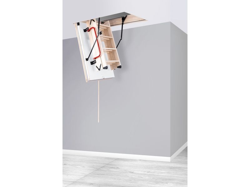 Dřevěné půdní schody slouží jako výlez do půdních prostor s dokonalým zateplením. Max. přípustná zátěž: 160 kg. Tloušťka izolace: 80 mm. Max. výška podlaží: 280 cm.