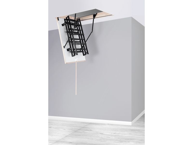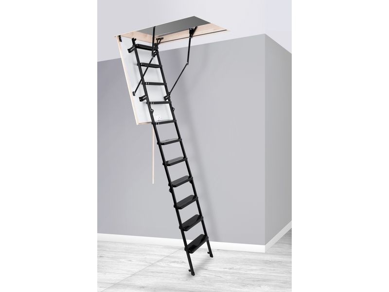 Skládací půdní schody s kovovým žebříkem slouží jako praktický výlez do půdních prostor. Max. přípustná zátěž: 210 kg. Tloušťka izolace: 20 mm. Max. výška podlaží: 280 cm.