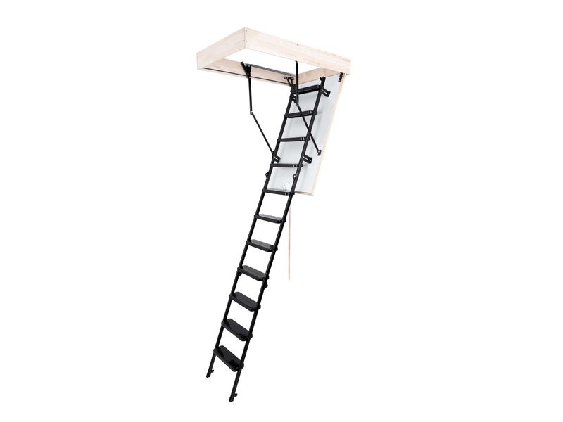 Skládací půdní schody mají 3-dílný kovový výlezový žebřík. Jednotlivé díly výlezového žebříku jsou spojovány speciální ocelovou sponou, která zajišťuje pevný spoj. Kovový žebřík je také snadnější na údržbu, je nalakován práškovou úpravou a odolává většímu opotřebení než dřevěný žebřík. Nášlapy mají protiskluzovou úpravu.