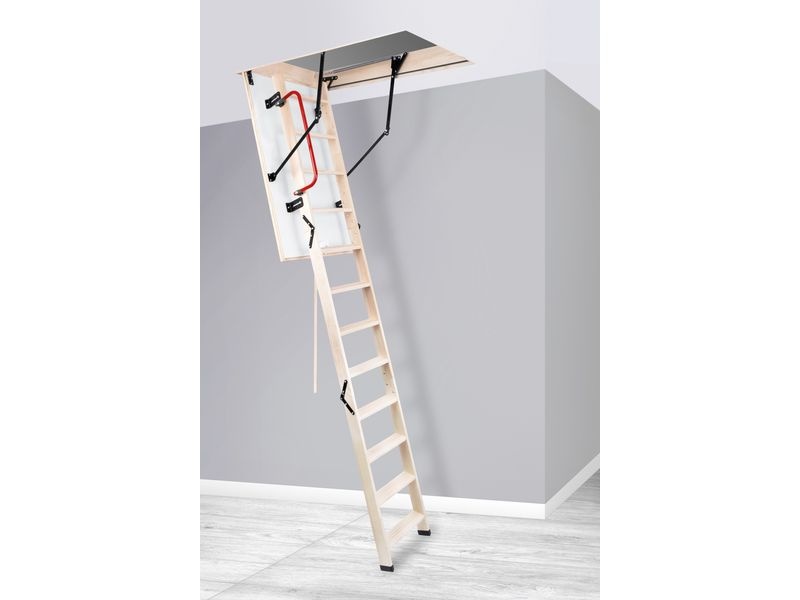 Skládací půdní schody jsou složeny ze tří dílů dřevěného výlezového žebříku. Jednotlivé díly jsou navzájem spojeny speciální ocelovou sponou, která zajišťuje pevný spoj. Dřevěné nášlapy mají protiskluzovou úpravu a s pomocným madlem zajišťují bezpečnější pohyb po schodech.