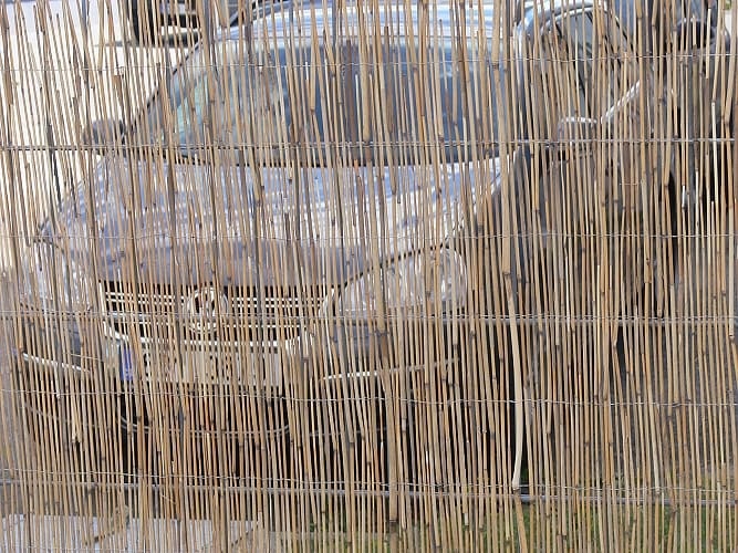 Rohož můžete instalovat také na stojící plot, stačí ji připevnit pevným vázacím drátem. V případě potřeby ji můžete upravit na požadovaný rozměr. Poté je třeba stébla znovu svázat vázacím drátem, kterým jsou štěpy spojeny, aby se vám rohož nerozpadla.