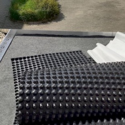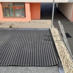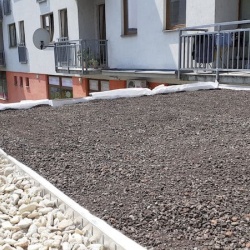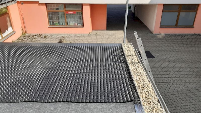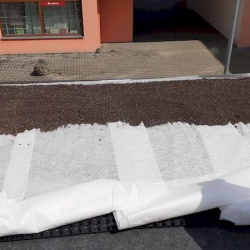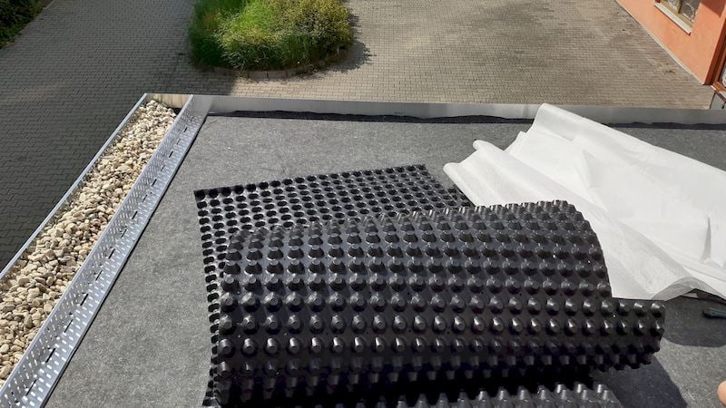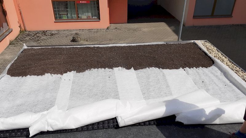 Realizace byla poměrně jednoduchá. Jediné, s čím jsme se potýkali bylo teplé slunečné počasí, při kterém nopová fólie velmi rychle „změkla“, čímž se snížila tuhost nopů a nebylo možné po ní pocházet. Instalaci jsme tedy prováděli postupně tak, že jsme natáhli jeden pás fólie, přikryli jej separační geotextilií a na ni umístili a rozhrnuli substrát.