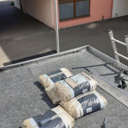 Vzhledem k tomu, že střecha byla funkční a nikam nezatékalo, žádné další úpravy (např. dodatečnou hydroizolaci) jsme neprováděli. Samotný přístup na střechu jsme řešili žebříkem, po kterém jsme postupně veškerý materiál ručně vynášeli.
