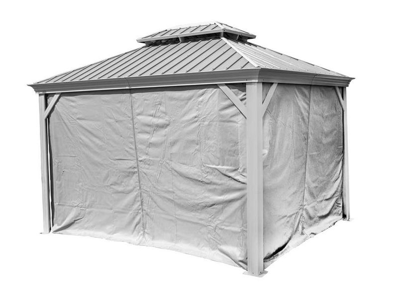Sada závěsů je určena pro celý altán. Pokrývá všechny strany, přičemž závěsy jsou připevněny na jinou kolejnici než sítě proti hmyzu pomocí dvojitého kolejnicového systému. Tím zajišťují jednudušší manupulaci.