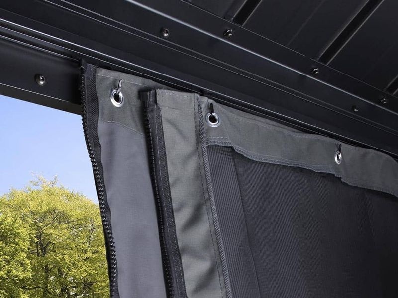 zavřeném stavu jsou závěsy připevněny pouze pomocí klipů. Vchod na zip je na každé straně altánu. Součástí dodávky jsou záclony a při­pevňovací klipy.