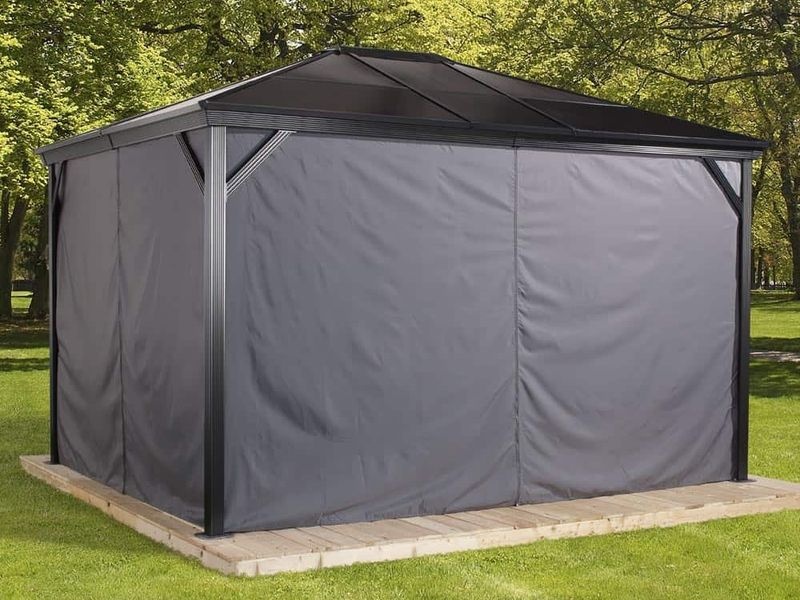 Sada závěsů je určena pro celý altán. Pokrývá všechny strany, přičemž závěsy jsou připevněny na jinou kolejnici než sítě proti hmyzu pomocí dvojitého kolejnicového systému. Tím zajišťují jednudušší manupulaci.
