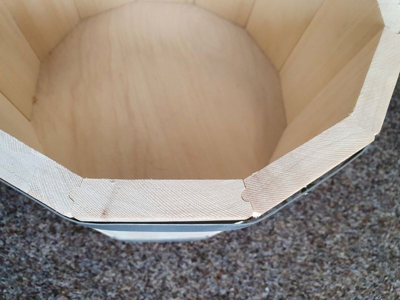 Saunové vědro ze smrkového dřeva. Vědro je vyrobené z 12 profilových prken v klasickém provedení bez plastové vložky. Profily je možné stáhnout dvěma plechovými pásky.