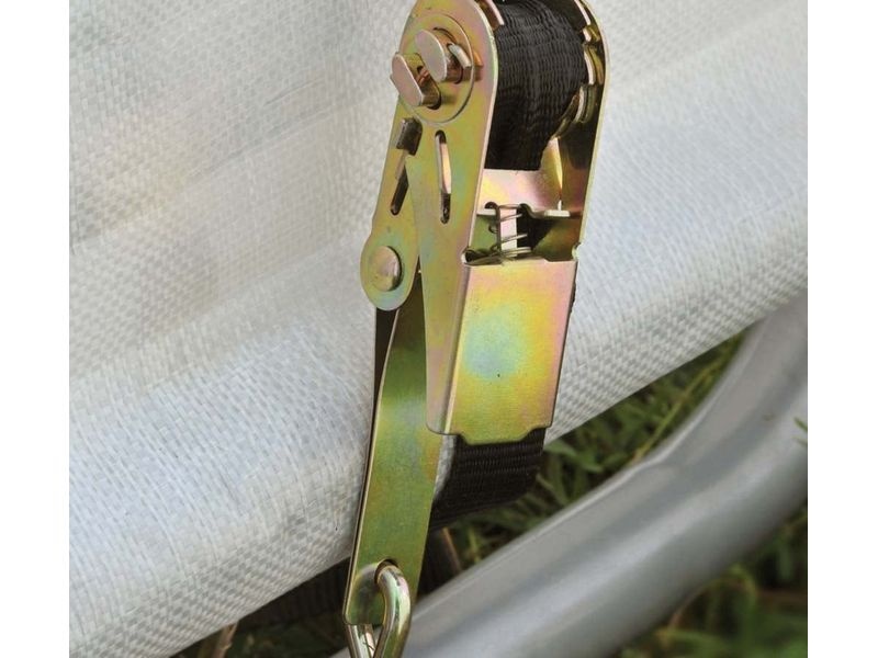 Konstrukce plachty je zajištěna upínacími ráčny a vstupní otvor je opatřen dvěma zipy a gumovými uzávěry pro snadné otevírání/uzavírání. V balení naleznete kompletní kotvící sadu, zahrnující čtyři kotvy o délce 38,1 cm. Také 8 upevňovacích popruhů, které slouží k zajištění plachty k rámu při větru a povětrnostních podmínkách.