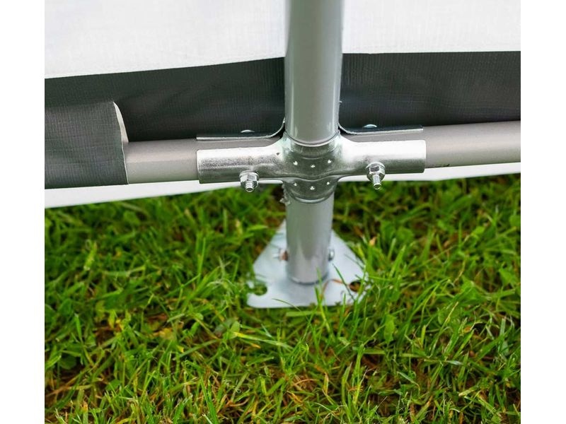 Konstrukce plachty je zajištěna upínacími ráčny a vstupní otvor (š. 300 × v. 180 cm) je opatřen dvěma zipy a gumovými uzávěry pro snadné otevírání/uzavírání. V balení naleznete kompletní kotvící sadu, zahrnující čtyři kotvy o délce 38 cm. Také 8 upevňovacích popruhů, které slouží k zajištění plachty k rámu při větru a povětrnostních podmínkách.