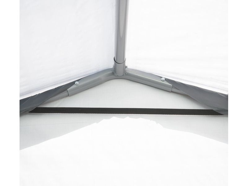 Konstrukce plachty je zajištěna upínacími ráčny a vstupní otvor (š. 240, 180 × v. 190 cm) je opatřen dvěma zipy a gumovými uzávěry pro snadné otevírání/uzavírání. V balení naleznete kompletní kotvící sadu, zahrnující čtyři kotvy o délce 38 cm. Také 8 upevňovacích popruhů, které slouží k zajištění plachty k rámu při větru a povětrnostních podmínkách. Zesílená zadní stěna zajišťuje dodatečnou stabilitu.