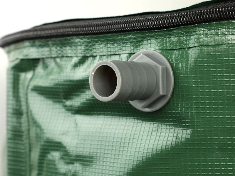 Sud je vyroben z pevného PVC a podepřen stabilním rámem z 8 PVC tyčí (Ø 20 mm). Víko je opatřeno zipem a integrovanou mřížkou proti nečistotám. Dva praktické výpustné ventily umožňují připojení hadice nebo pohodlné plnění konve. Sud je vybaven i přepadem, který zabraňuje přeplnění. Díky jednoduchému montážnímu systému zvládnete stavbu během krátké chvíle bez použití speciálního nářadí.