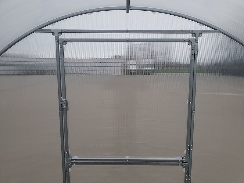 zahradní skleník TIBERUS pozinkovaný ocelový profil 1 mm, rozteč oblouků 100 cm, dvojité dveře vpředu, ventilační okno vzadu, prosklení nutno vyřezat z dodaných polykarbonátových desek, možnost montáže střešního okna – ano