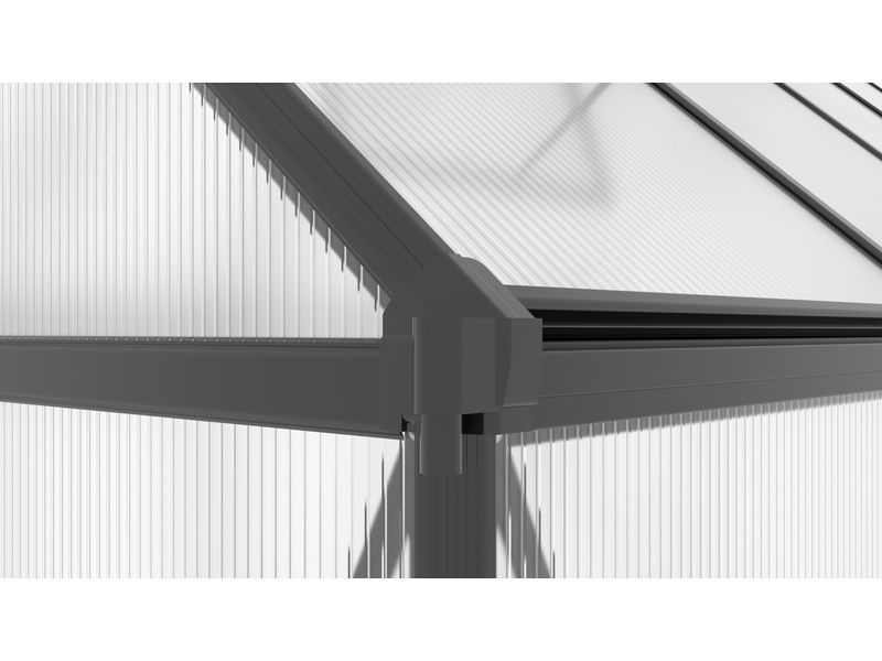 Skleník je dále vybaven uzavřenými bočními hranami polykarbonátu, které přispívají k jeho dlouhodobé trvanlivosti. Hlavní předností modelu jsou zesílené nosné profily, které výrazně zvyšují jeho pevnost a odolnost vůči povětrnostním podmínkám, jako je silný vítr a sněhové zatížení.