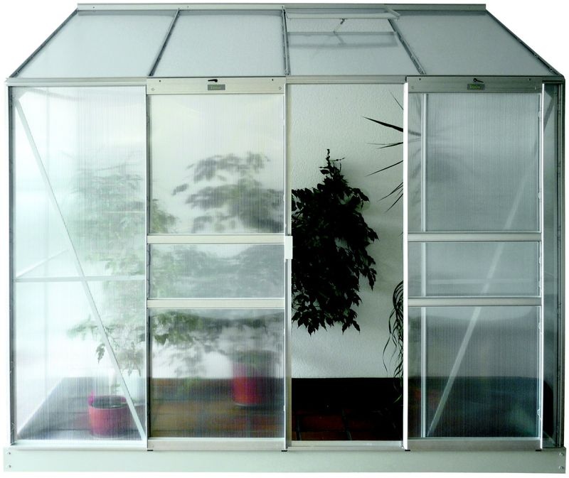 Skleník je vybaven: jednokřídlými dveřmi (velikost 122 × 163 cm), AL profily, prosklením, 1 střešním ventilačním okénkem s manuálním otevíráním, veškerým spojovacím materiálem.