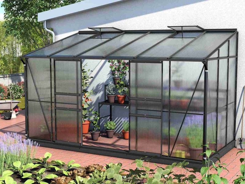 Polykarbonátový skleník ke zdi je vybaven dvěmi střešními okny a posuvnými dvoukřídlými dveřmi (velikost 1,22 × 1,63 cm). Ty umožňují příjemný přístup do veškerých prostor skleníku. Dvě střešní okna s manuálním otvíráním zajišťují ventilaci a cirkulaci vzduchu.