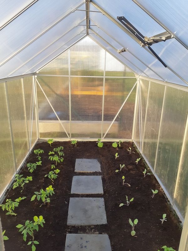 Balení obsahuje: jednokřídlé posuvné dveře (š. × v. otvoru 61 × 61 cm), AL profily, prosklení, 2× střešní ventilační okénko s manuálním otevíráním a veškerý spojovací materiál. Skleník můžete postavit buď na zděnou (betonovou) podezdívku, nebo na základnu z pozinkovaného plechu.
