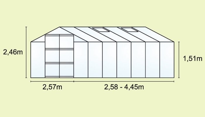 Polykarbonátový skleník s polykarbonátem o tl. 4 nebo 6 mm a hliníkovou konstrukcí. Skleníky jsou dostupné ve stříbrné nebo v zelené barvě. Zhotoveno uznávaným britským výrobcem skleníků. Ideální pro pěstování teplomilných rostlin. Zastavěná plocha: 6,63 – 11, 44 m(viz tabulka jednotlivých variant skleníku v popisku níže).