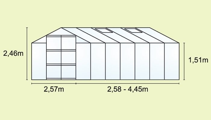 Balení obsahuje: dvoukřídlé posuvné dveře (š x v otvoru – 122 × 191 cm), AL profily, prosklení, 2× střešní ventilační okénko s manuálním otevíráním, veškerý spojovací materiál. Skleník je možné postavit buď na zděnou (betonovou, jinou) podezdívku, nebo na základnu z pozinkovaného plechu.