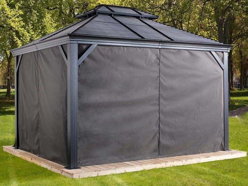 Sada závěsů je určena pro celý altán. Pokrývá všechny strany, přičemž závěsy jsou připevněny na jinou kolejnici než sítě proti hmyzu pomocí dvojitého kolejnicového systému. Tím zajišťují jednudušší manupulaci.