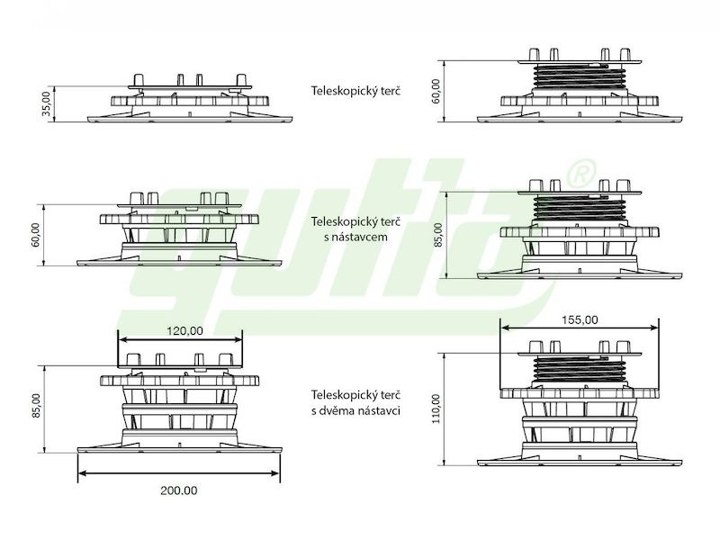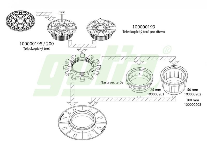 Určeno pro suché kladení podkladových profilů na zpevněný podklad. Pro vyrovnání výškového rozdílu jsou terče vybaveny závitem. Po vyšroubování na požadovanou výšku se terč zaaretuje objímkou. K terčům lze doobjednat nástavce, díky kterým lze terčem nastavit téměř libovolnou výšku.