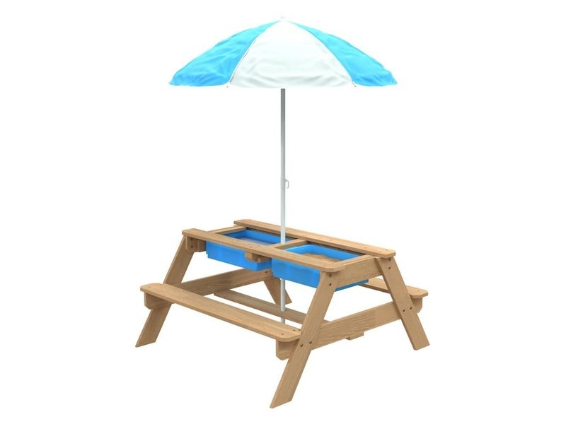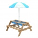 Součástí dřevěného hracího stolu Tiger je také barevný slunečník. Nemusíte se tak bát, že by vaše děti byly dlouho vystavovány přímému sluníčku. Poskytne příjemný stín a děti potěší svými veselými barvami.