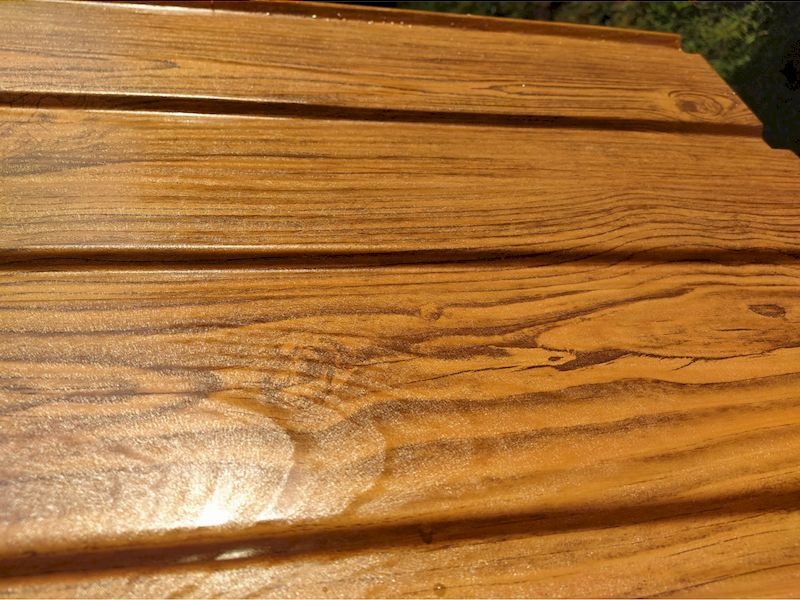 Při použití tohoto trapézového plechu již nikdy nebutete muset ze žebříku brousit a opakovaně natírat vaše podbití ve štítu domu, plot či zahradní domek. Dřevěný dekor je pouze z pohledové strany, zadní je opatřena šedou barvou. Montáž se provádí na rošt ze dřeva i kovových profilů pomocí samořezných vrutů v barvě plechu.