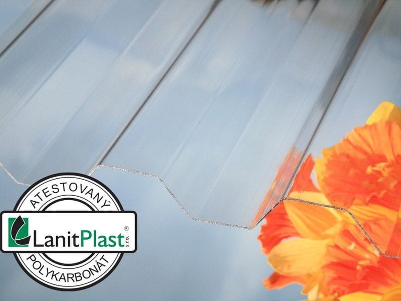 Trapézové desky z polykarbonátu o síle 0,8 mm jsou úplně hladké, průhledné, bez povrchové krupičky. Polykarbonátové desky dodáváme v čiré nebo v průhledné kouřově hnědé barvě.