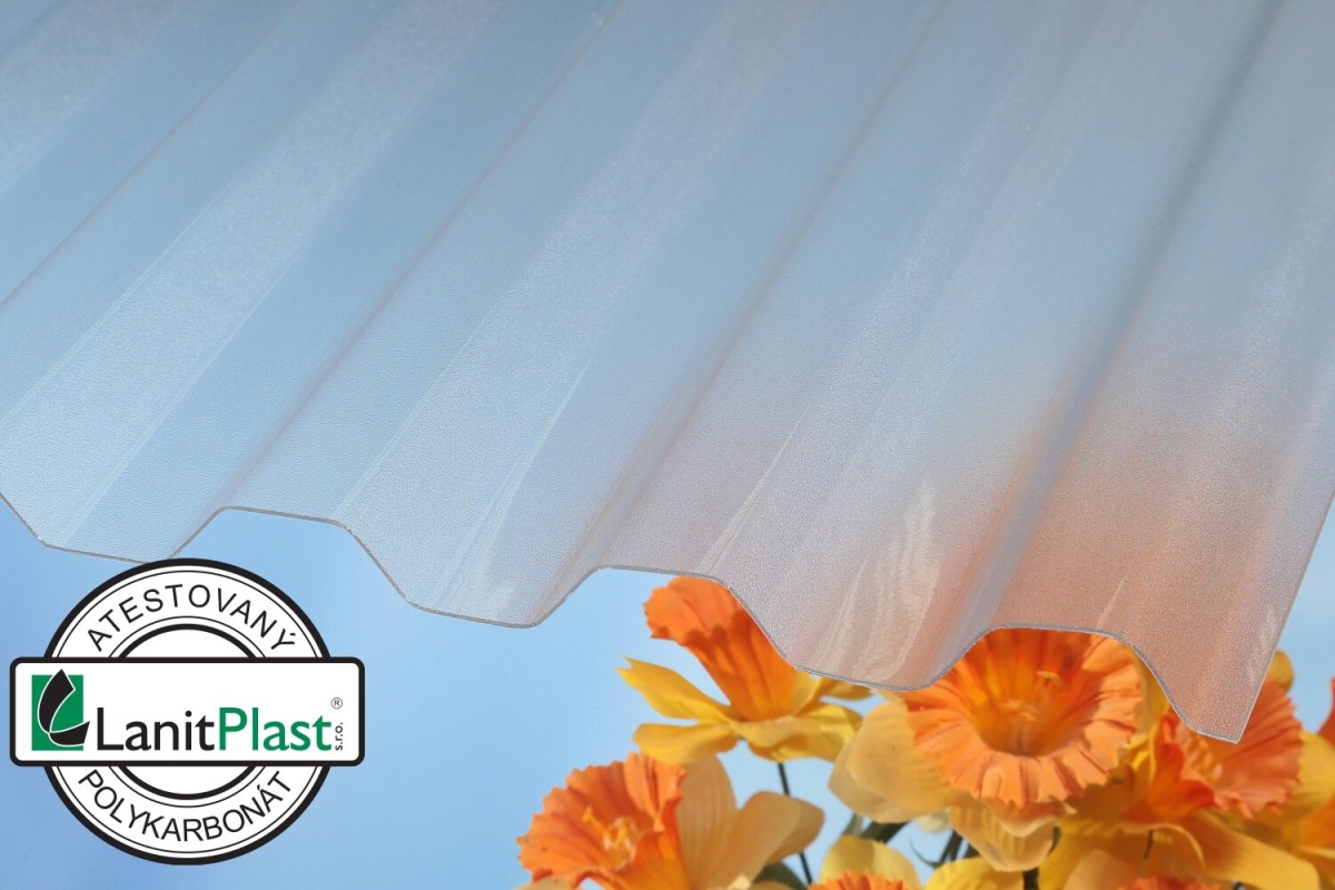 Trapézové desky z polykarbonátu o síle 0,8 mm s extrémně jemnou, matově sametovou povrchovou strukturou (krupičkou) na vnitřní straně desky. Povrchová struktura láme světlo, takže desky nejsou úplně průhledné, ale výrazně průsvitné a vzniká pod nimi příjemný chládek při zachování světelné propustnosti.