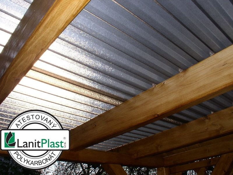 Trapézová polykarbonátová deska s povrchovou krupičkou na vnitřní straně (určenou pro rozptyl světla). Profil 76/16. Povrchová krupička láme světlo, takže desky nejsou úplně průhledné, ale průsvitné. Vzniká pod nimi příjemný jemný chládek při zachování světelné propustnosti.