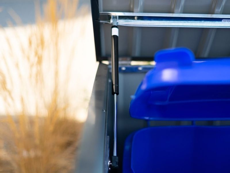 Box je vybaven plynovými písty pro bezpečné a pohodlné otevírání víka. Integrované řetízky umožňují připojit popelnice tak, aby se jejich víko otevíralo současně s víkem boxu. Extra široká dvoukřídlá vrata (172,5 × 127 cm) usnadňují přístup a pohodlné vysouvání nádob.