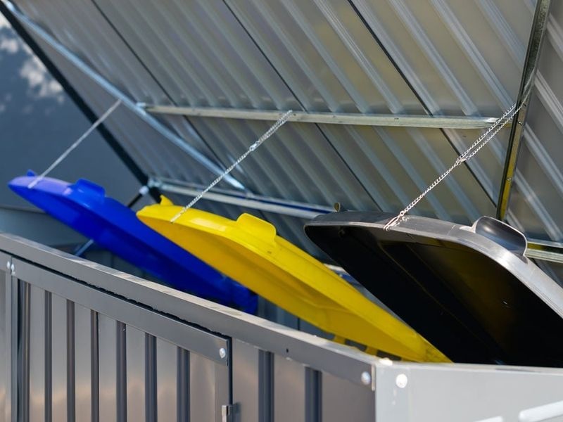Kromě uskladnění odpadových nádob můžete box využít také jako zahradní kůlnu pro nářadí, hračky nebo bazénové příslušenství. Díky přípravě na visací zámek (zámek není součástí dodávky) máte jistotu, že obsah bude vždy v bezpečí.