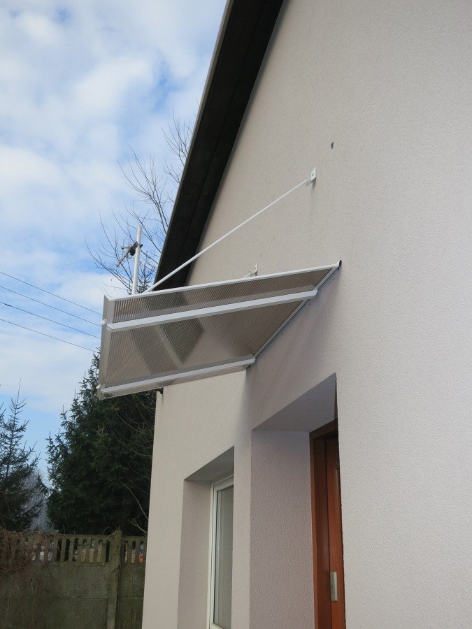 Rovná stříška nad vchodové dveře se závěsy, vyrobená z 4,5 mm silného dutinkového polykarbonátu a práškově lakovaných hliníkových profilů. Obsahuje dva silné závěsy pro zvýšení stability.