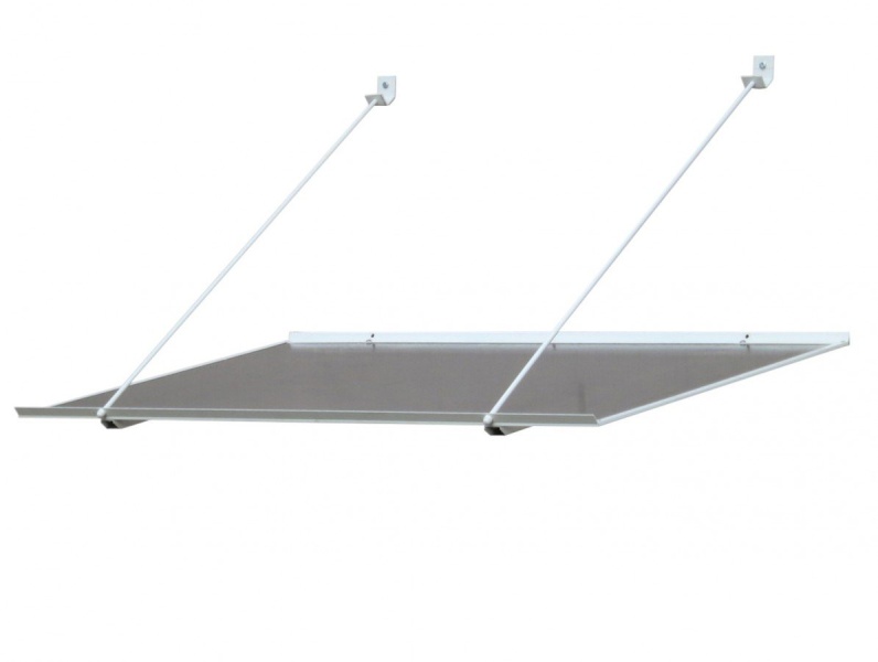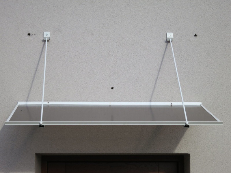 Rovná stříška nad vchodové dveře se závěsy, vyrobená z 4,5 mm silného dutinkového polykarbonátu a práškově lakovaných hliníkových profilů. Obsahuje dva silné závěsy pro zvýšení stability.