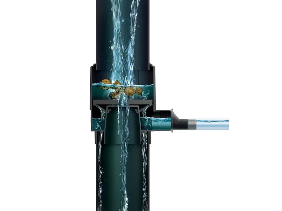 Okapový filtr se instaluje přímo na rour svodu. Je určený pro potrubí o průměru 75 mm, 90 mm, 100 mm a 110 mm.